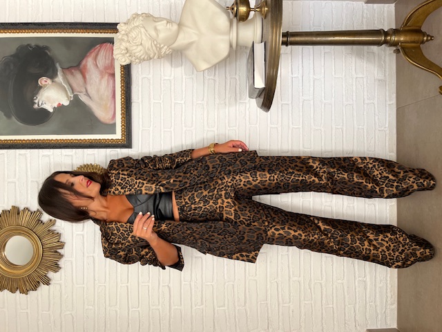 Blazer de cuello solapa y manga larga con hombreras. Bolsillos delanteros de vivo. Cierre frontal cruzado con botones. Forro interior. Estampado animal print satinado.