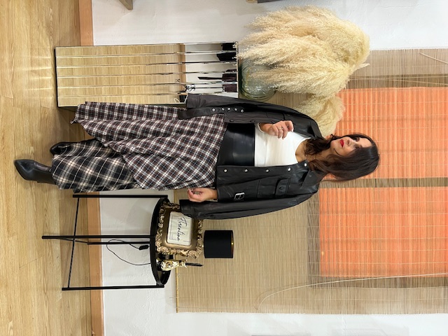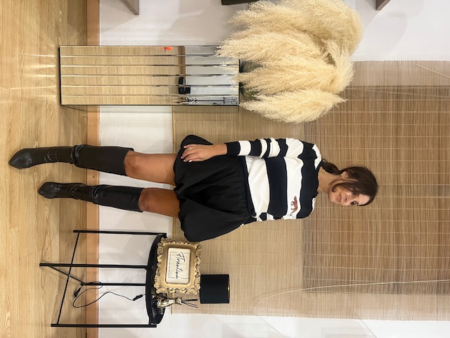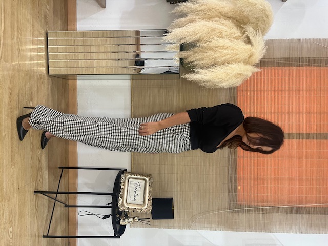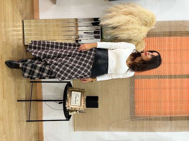 Falda con parte superior en efecto piel negra, cierre con cremallera invisible lateral.  Bajo de falda en tejido de cuadros combinados.