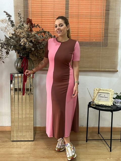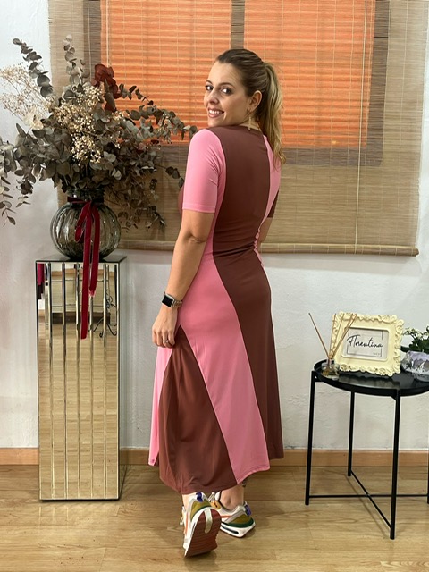 Vestido midi fluido bicolor. Cuello redondo y manga corta. Tejido elástico. Forro interior elástico.